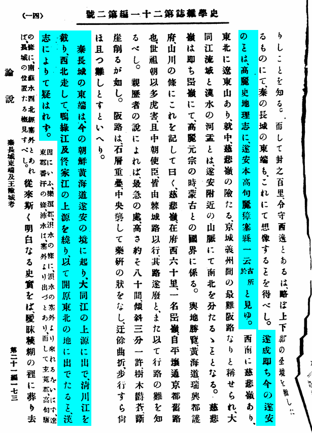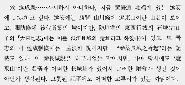 진장성의 동단이 지금의 조선 황해도 수안(遂安)의 경내에서 시작하여 대동강 상류의 시원으로 나와서 청천강을 끊고, 서북으로 달려, 압록강 및 동가강 상류의 시원을 둘러싸고서 개원(開原) 동북 지역으로 나온다는 사실은 《漢書(한서)》 '지리지'에 의하여 의심할 바 없다. 秦長城の東端は,今朝鮮黃海道遂安の境に起り,大同江の上源出で、淸川江を截り、西北走して鴨綠江及佟家江の上源を繞り、以て開原東北の地に出でたること、漢志によりて疑はれず。