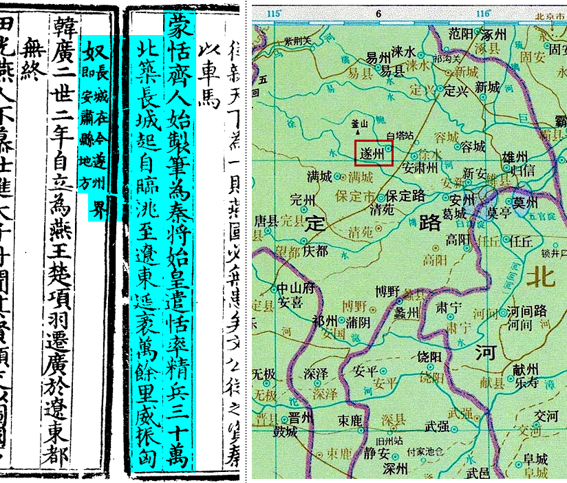 진(秦)나라의 만리장성(萬里長城)이 있었다는 명(明)대의 遂州(수주)가 정확히 지금의 보정시(保定市) 서수구(徐水區) 수성진(遂城鎮)의 위치에 표기되어 있다. (본 지도 출처: 譚其驤 中國歷史地圖集7-精裝本-元明)
